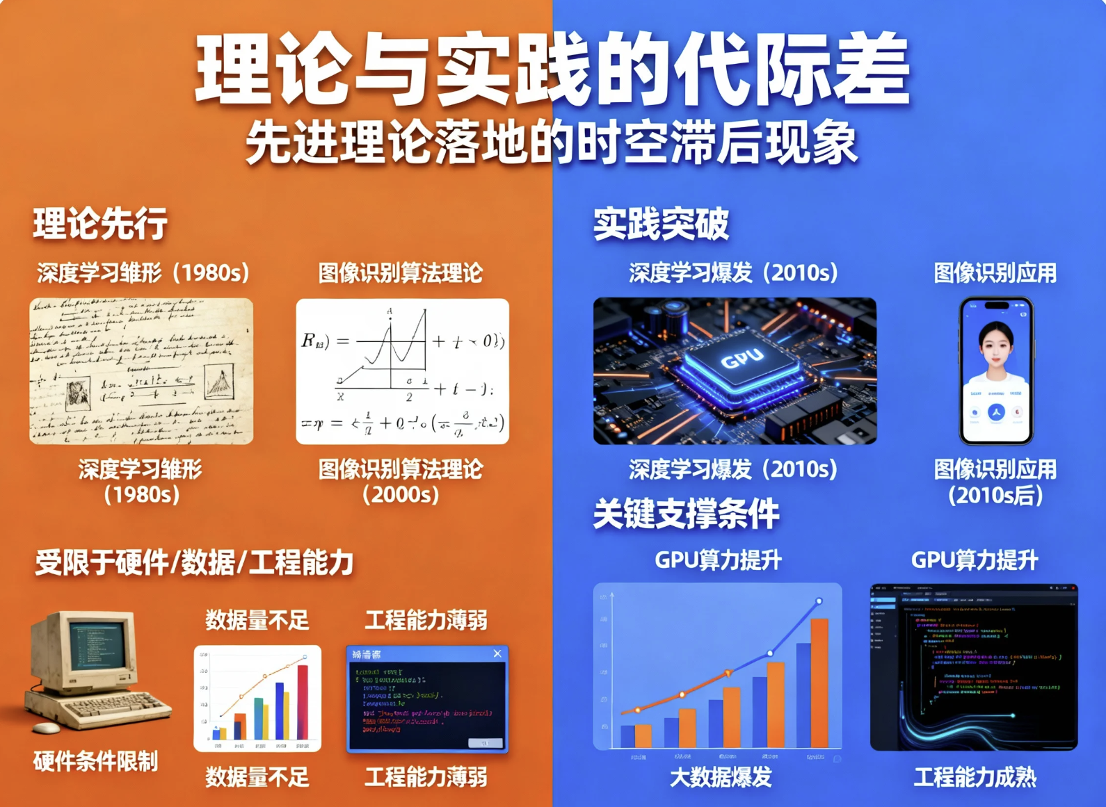 我们身边总有这样的例子:很多先进理论早在几十年前就被提出,却迟迟无法落地。比如深度学习的雏形几十年前就有了,但直到GPU算力提升、大数据爆发才真正火起来;很多图像识别算法理论完美,却受限于早年硬件条件无法应用。