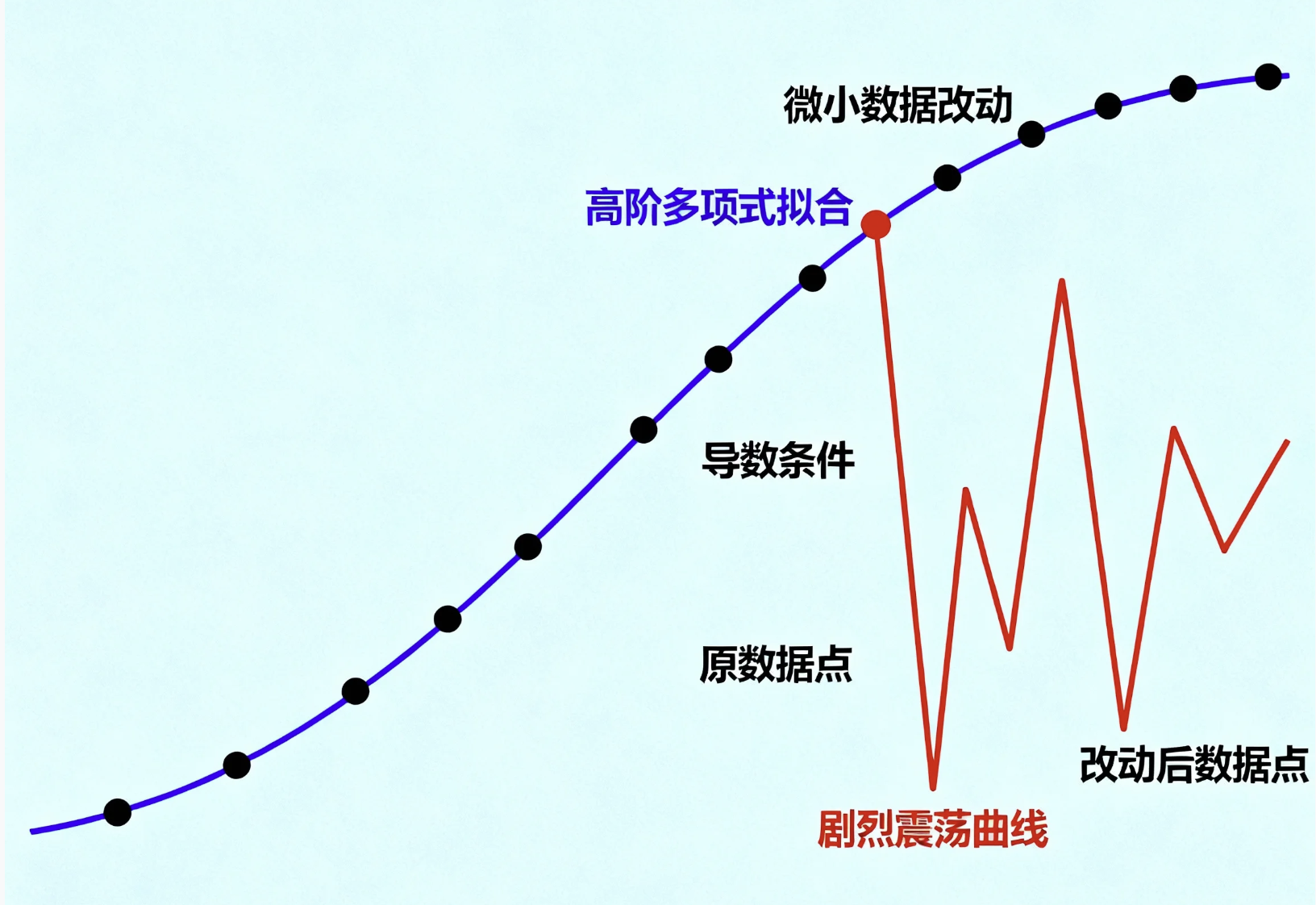 简单说就是,当给多个点加上高阶导数条件,试图用高阶多项式拟合时,多项式会"疯掉 "。哪怕改动一个点的微小数据,整条曲线都会剧烈震荡 ,面目全非。