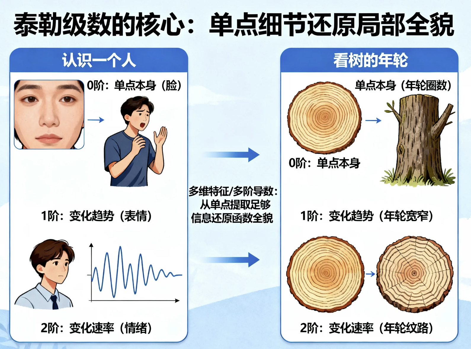 不管是"多维特征"还是"多阶导数",都是为了从一个点里挖出足够多的信息,还原这个点附近的函数全貌。泰勒级数的核心,就是用单点的"全部细节",还原局部的真实模样。