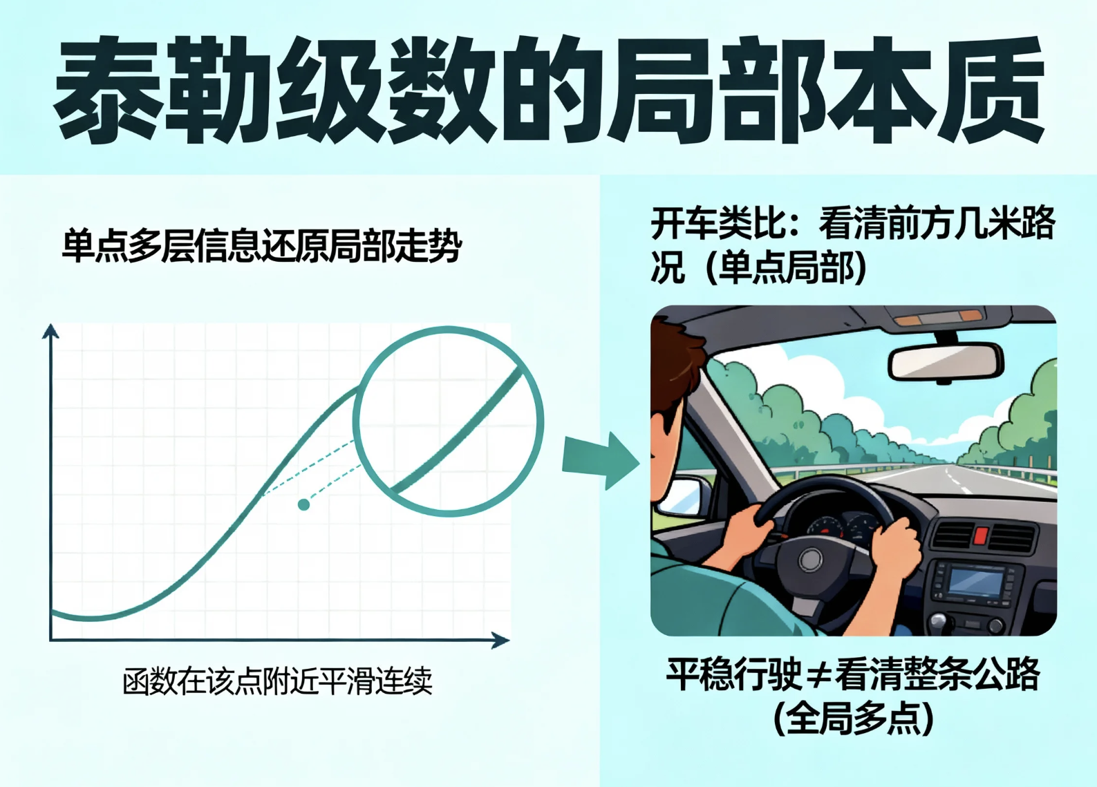 泰勒级数不一样,它抓的是函数的局部 本质。只要这个点附近的函数是平滑连续 的,就能靠单点的多层信息精准还原局部走势。它从设计之初就没打算"描述整条曲线",目标就是解决局部问题------这是理解泰勒级数的第一个关键。