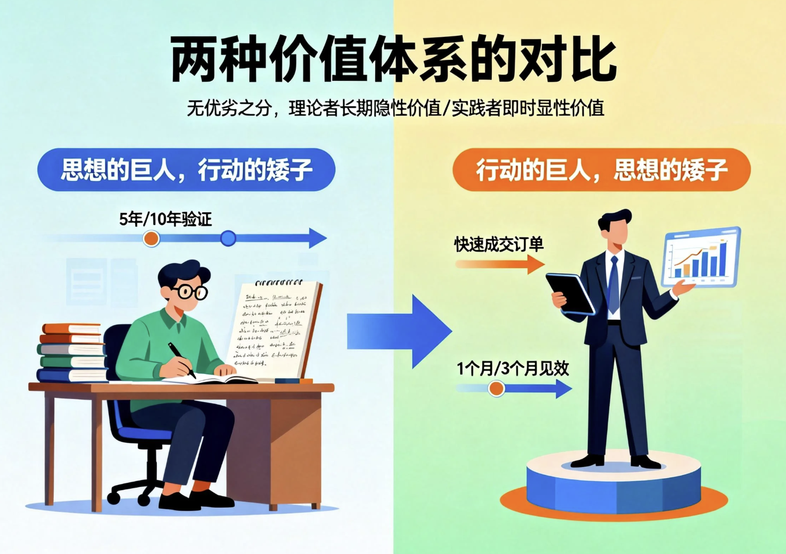 这两种人没有优劣之分,只是属于不同的价值体系。理论研究者的价值是长期隐性的,需要时间验证;实践者的价值是即时显性的,能快速解决现实问题。