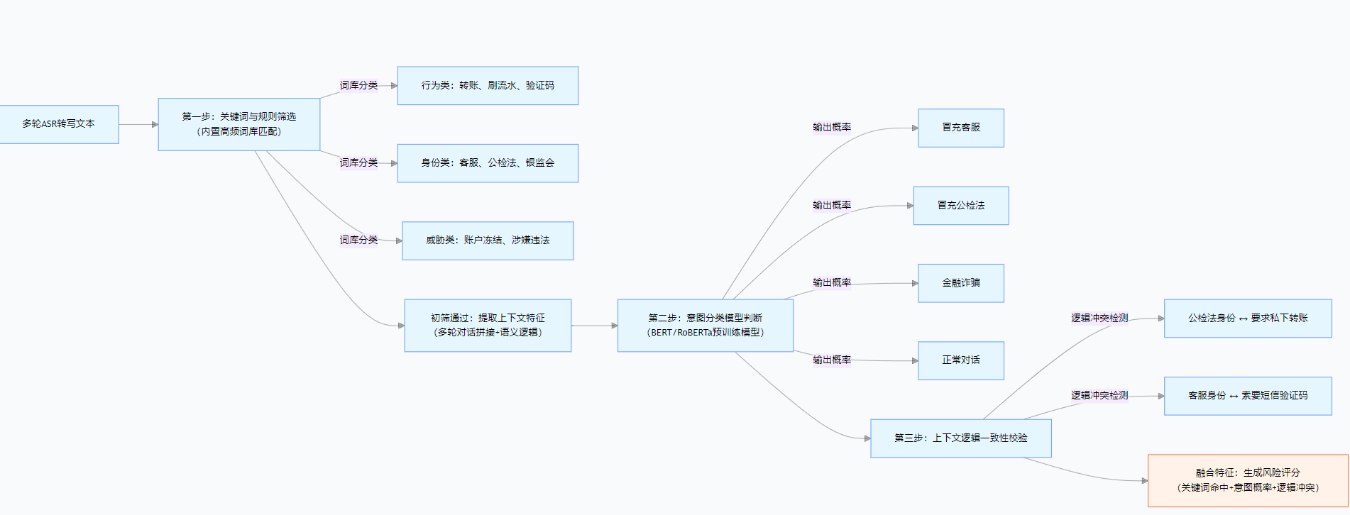 过了初筛的内容,就会进入核心环节------意图分类判断。这一步靠的是基于BERT、RoBERTa这类预训练模型搭建的识别系统,输入的就是ASR转写好的文字,还能把多轮对话的内容拼起来一起分析。最终会给出几种结果的概率,比如是冒充客服、冒充公检法,还是正常对话。