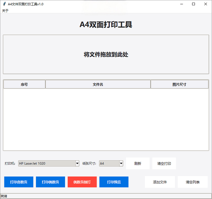 使用方法 4.1 基本操作1. 启动程序,程序自动获取系统默认打印机2. 选择纸张尺寸(默认A4)3. 将需要打印的文件拖放到拖放区域4. 根据需要选择打印奇数页或偶数页5. 偶数页打印时可选择倒打功能 4.2 高级功能- 点击"刷新"按钮更新打印机列表- 点击"清空打印"按钮删除当前打印机的所有打印任务- 通过菜单栏"关于"选项查看软件信息