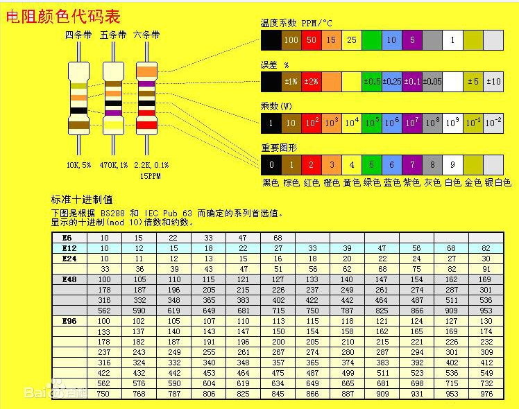 由三个数字组成。通常表示精度±5%,±2%,前面两位是有效数字,第三位数表示科学计数法中10的幂指数,基本单位是Ω。即10*10^3Ω=10KΩ。