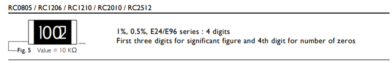 由四个数字组成,通常表示精度±1%、0.5%,前面三位是有效数字,第四位表示科学计数法中10的幂指数,基本单位是Ω。即1002=100*10^2Ω=10kΩ