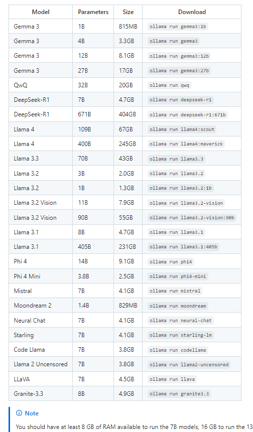 - https://github.com/ollama/ollama?tab=readme-ov-file#model-library