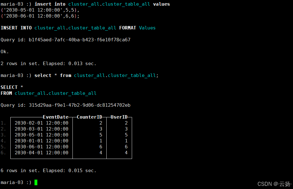 在节点2或节点3的CK客户端,继续向分布式总表写入数据并查询: