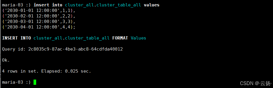 在任意节点的CK客户端,向分布式总表写入数据:
