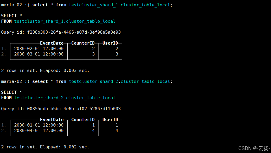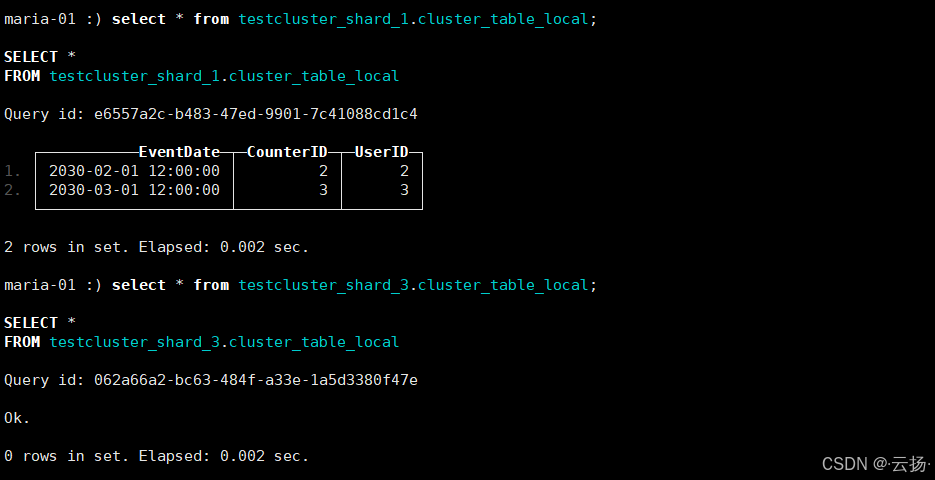 - 查询本地表 :分别在3个节点查询对应分片的本地表,验证数据是否按规则分片存储: