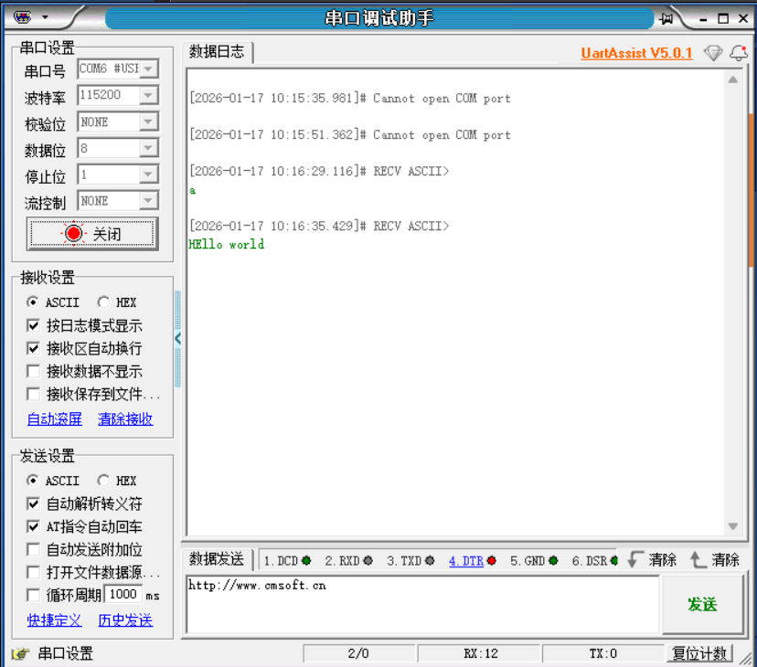 打开串口调试助手,选择ASC2码格式: