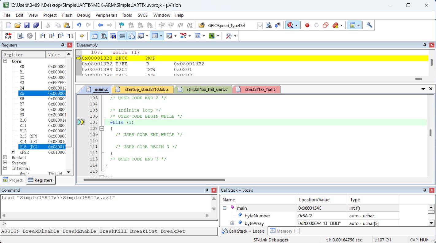 鼠标右键点击数据发送的代码行,选择"Run to Cursor line":