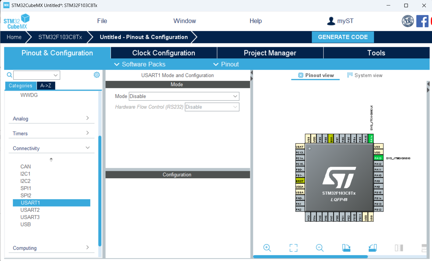 选择芯片------选择调试串口------选择左侧的"Connectivity"(连接性),