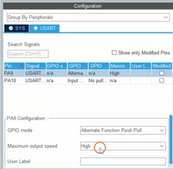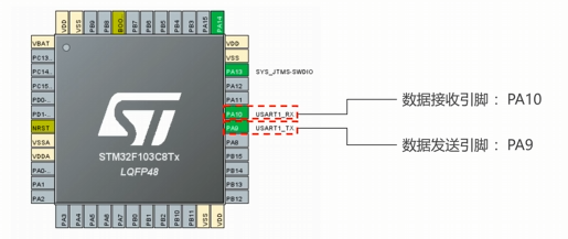 USART1_Tx位于PA9,USART1_Rx位于PA10。