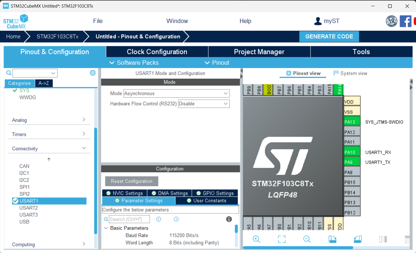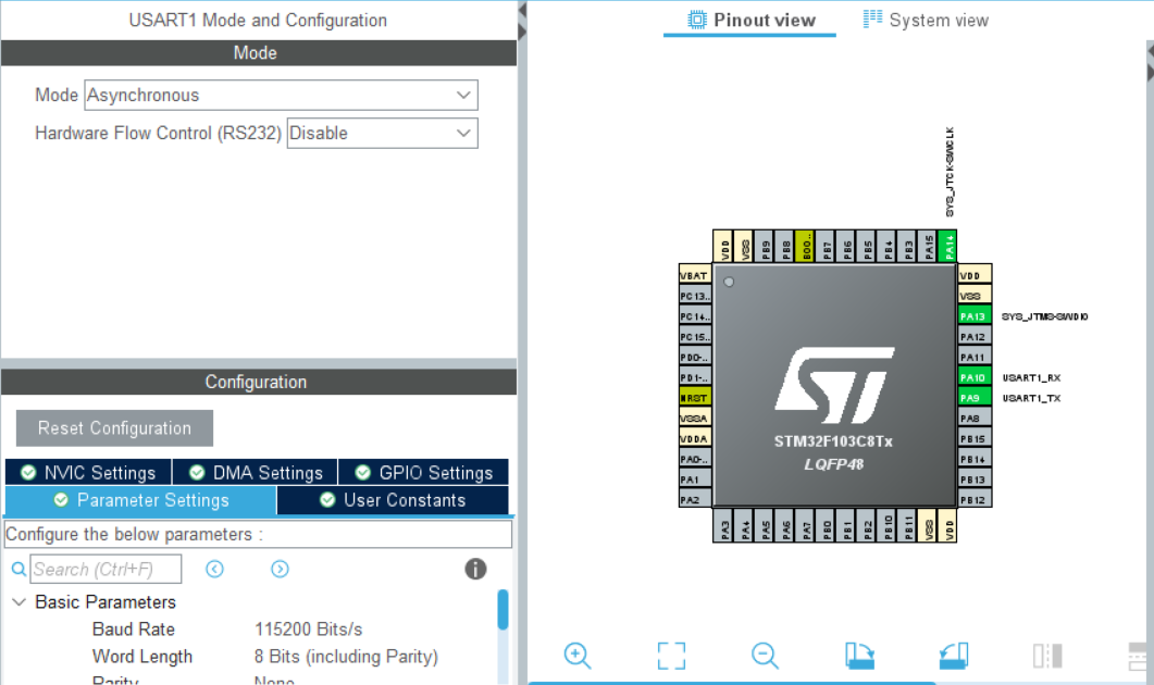 cubeMX自动为我们分配好了USART的引脚: