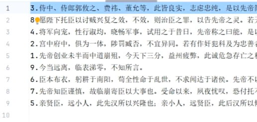 现有一个《出师表》的文本文件,但文章行序被打乱。每行开头有数字编号表示正确顺序,我们需要:
