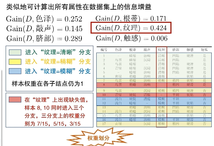 只有最后算数据集信息增益时,需要乘以ρ,只算无缺失值的权重。