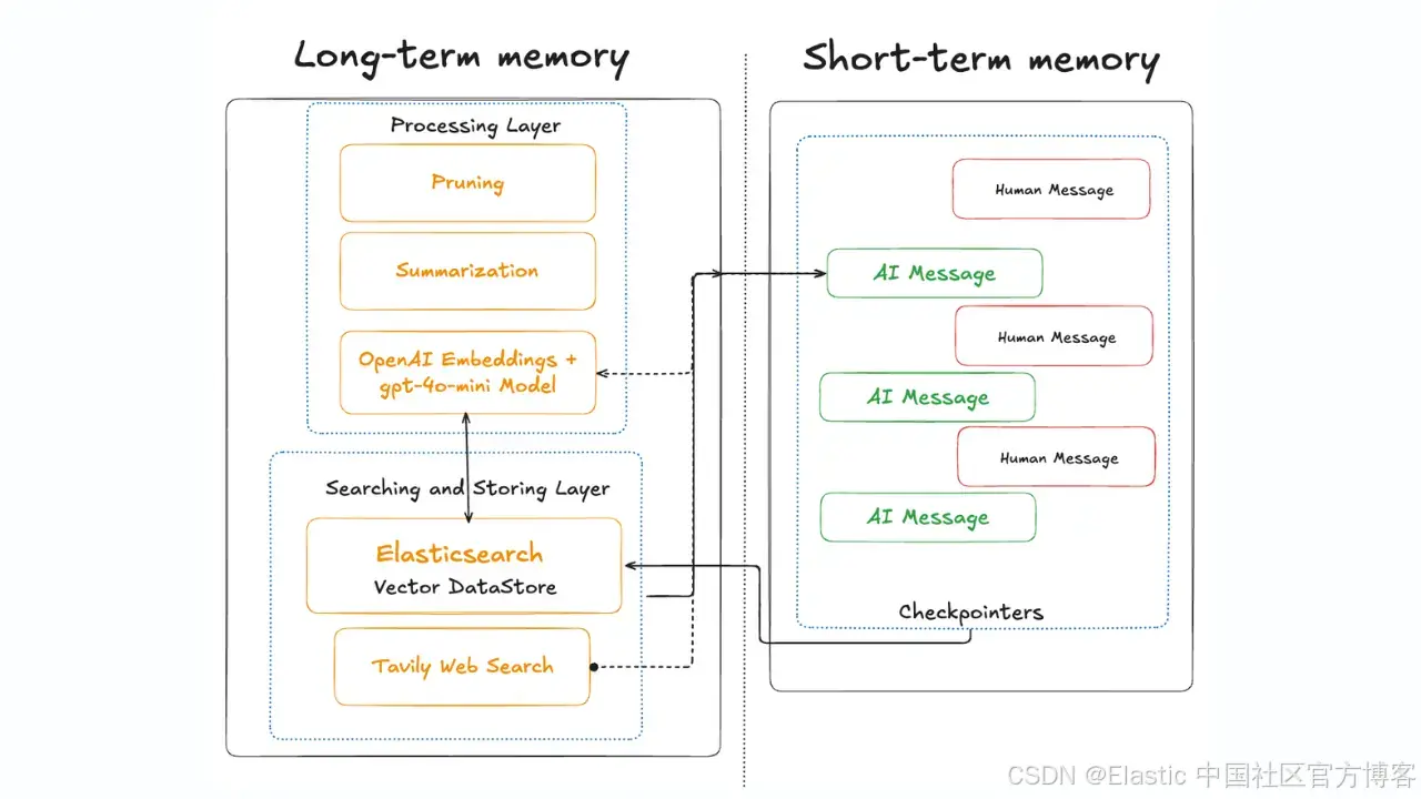 对于长期记忆,以下是我们如何在 Elasticsearch 上执行语义搜索:在将 checkpoint 总结并索引到 Elasticsearch 后,使用向量嵌入(vector embeddings )检索相关的历史对话。