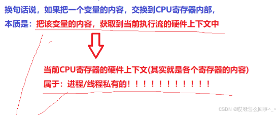 CPU内的寄存器硬件只有一套 但是CPU内的数据可以有多份 各自一份执行当前的执行流的上下文 换句话说若是把一个变量的内容交换到CPU寄存器内部 本质上就是将当前变量的内容获取到执行流的硬件上下文中