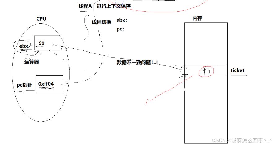 当CPU调度A时 载入ticket变量 进行计算之后 也就是计算的那条汇编代码走完之后 突然调度 B 此时进行调度的相关操作 先保存线程A的上下文 之后将ebx的中的值导入为B看到的ticket 并且将pc指针指向执行流B的代码 此时调度B