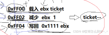 这句代码在编译之后会转换为汇编代码 有三行 第一个是将ticket的值载入CPU的ebx寄存器 第二个是CPU运算器进行计算 第三个是将计算之后的结果写回内存