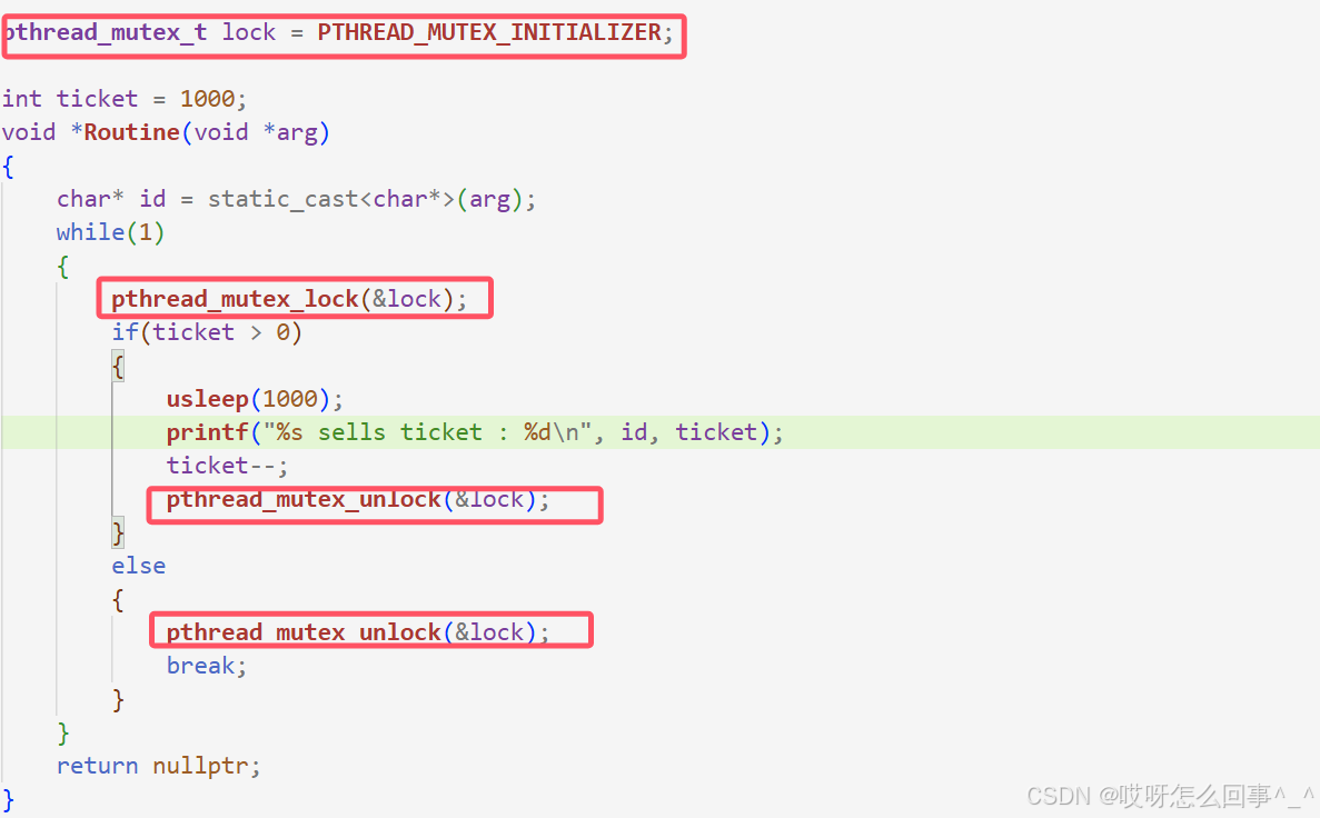 访问ticket的代码叫做临界区 ticket叫做共享资源 当ticket被保护起来就叫做临界资源 没有访问共享资源的代码叫做非临界区