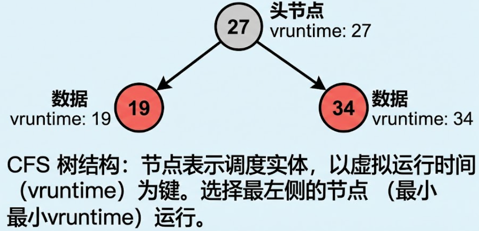 CFS (完全公平调度器):每个任务按权重(基于 nice 值)公平分配 CPU 时间。使用 虚拟运行时间 来衡量公平性:每个 CPU 维护一个 红黑树,树节点按 vruntime 排序(左子树 vruntime 最小)。调度过程选择下一个任务:总是挑选红黑树最左节点(vruntime 最小,即"最欠 CPU"的任务)。