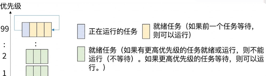 调度过程:任务运行直到:自愿让出(yield)、阻塞(I/O 等)、或被更高优先级实时任务抢占。