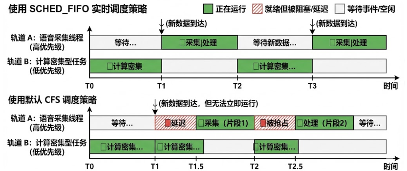 为了保障这一点,我把语音采集线程设为高优先级,并采用了 Linux 的 SCHED_FIFO 实时调度策略,而不是默认的 CFS(完全公平调度器)。这是因为:语音采集本质上是 I/O 密集型任务,它大部分时间其实在等待音频设备的数据(比如通过 ALSA),处于阻塞状态;一旦有新数据到达,它需要立刻被唤醒并处理,不能被其他计算密集型任务(比如大模型推理)抢占;而由于它运行时间很短、很快又会主动让出 CPU(回到阻塞状态),即使优先级很高,也不会导致其他线程"饿死" ------相反,它释放 CPU 后,计算线程就能立即接手做预处理或推理。