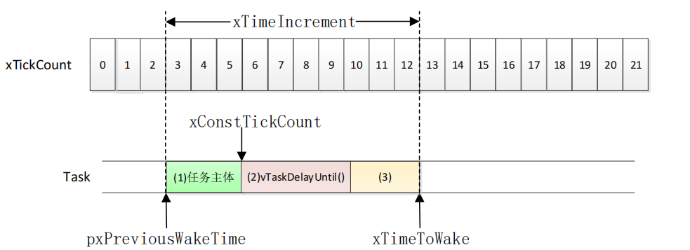 xTimeIncrement:任务**需要延时的时间节拍数**(相对于 pxPreviousWakeTime 本次延时的节拍数)。 -