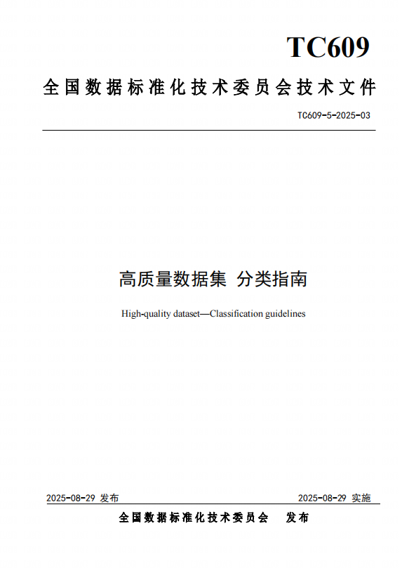 《高质量数据集 分类指南》(TC609-5-2025-03)是由全国数据标准化技术委员会 发布的技术文件 ,旨在为高质量数据集提供一套清晰、统一的分类体系与方法 ,以解决当前高质量数据集分类标准缺失、类型界定模糊的问题,从而优化数据资源的供需匹配与流通应用,更好地支持不同类型人工智能模型的开发与训练。