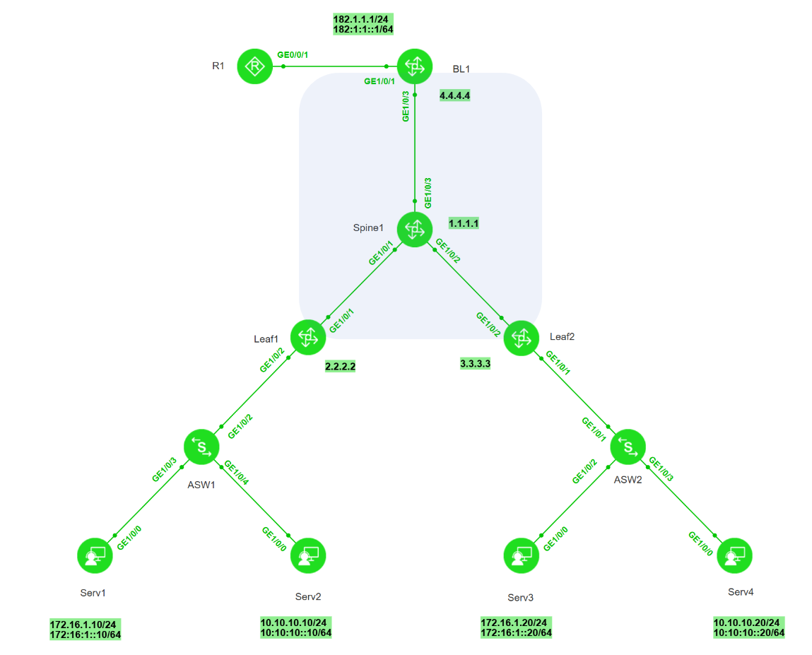 在上一篇《ENSP Pro Lab笔记:配置BGP EVPN VXLAN双栈(1)》中,我们完成了基于 Spine-Leaf 架构的 IPv4/IPv6 双栈网络配置。在进入具体的 Packet Walk(数据包转发路径)分析之前,我们需要重新审视一下这个实验环境的"骨架"和"神经系统"。