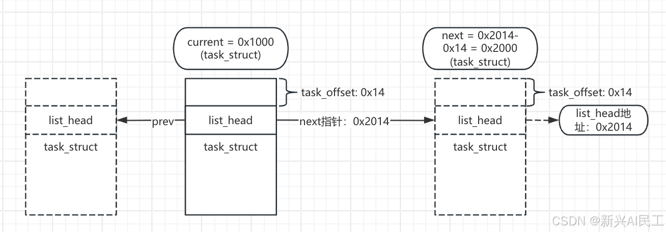 - offsetof(struct task_struct, tasks) → 计算出tasks在task_struct中的偏移0x14;