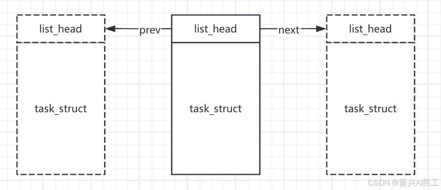 task_struct中的tasks成员变量,配合上面的list_head结构一起,就可以将所有的进程结构串起来,形成一个双向链表。
