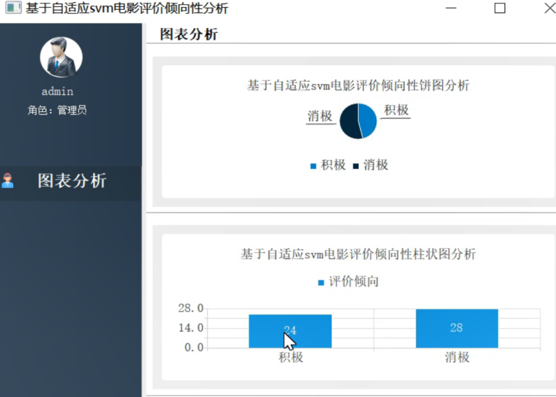 通过图表分析洁敏可以查看到系统内的电影评价倾向性分析数据统计,结合饼状图和柱状图来呈现电影评价积极和消极的分类占比,利用图表呈现更加直观的分析结果。