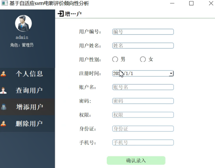 通过用户管理界面可以实现用户信息的查询、新增以及删除,用户信息主要包括了用户编号、姓名、性别、注册时间、身份证号以及手机号等个人基本资料,同时还包括登录系统所需要的账户名、密码和权限,通过用户管理界面可以实现个人资料的修改和新增。