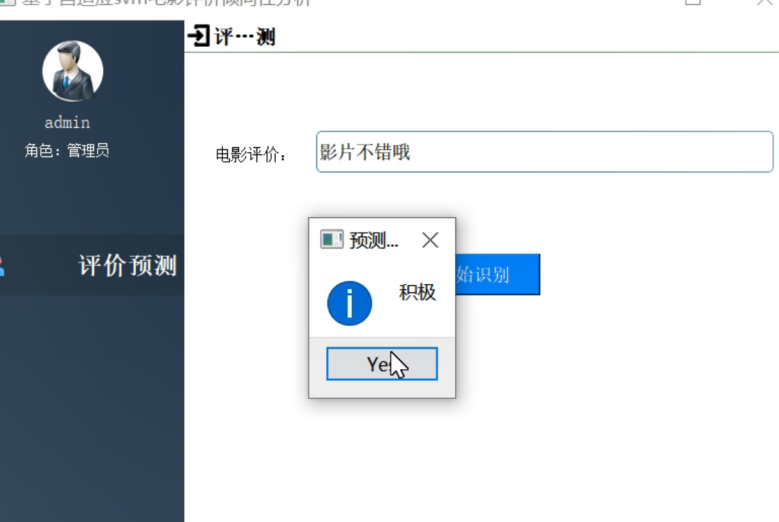 用户通过评价预测界面可以实现电影评价信息的录入,通过点击开始识别按钮可以实现在线的评价测评,结合系统算法实现了测评结果信息的反馈