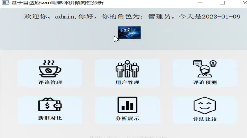 此次对于电影评价倾向性系统平台的主业内容主要包括了电影评论管理、系统注册用户管理、评论预测、新旧对比、评价分析展示以及算法对比等内容,作为分析型的系统平台,通过评论信息的录入可以判断评价内容的所属类型,具体系统主页的主要功能模块内容呈现如下图所示: