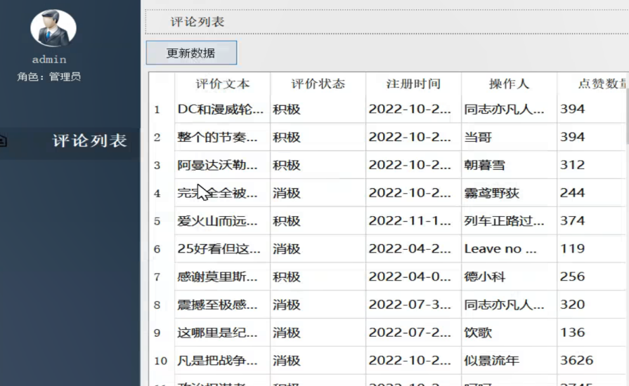 通过评论管理界面可以查看到最新的电影评价信息以及对应的分析评价状态,结合电影评价文本的字段内容来搭判断电影评价属于积极还是消极,通过时还包括了相关评论的评论人及点评点赞次数,通过更新数据可以实现评论信息的自动刷新。