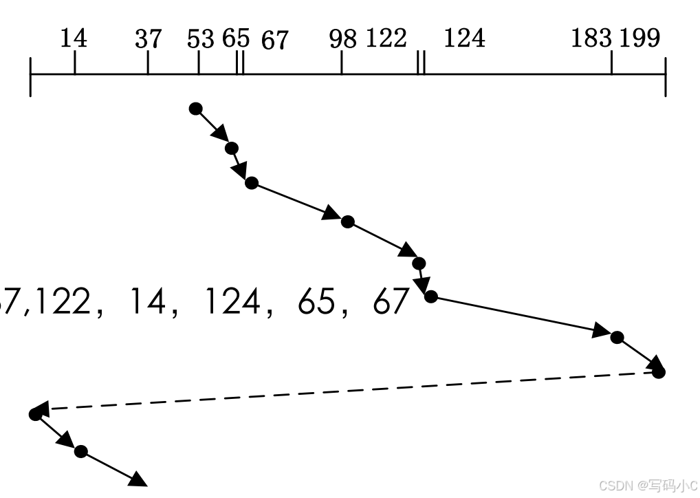 - 假设向磁道号增加的方向移动:53 -> 65 -> 67 -> 98 -> 122 -> 124 -> 183 -> (掉头) -> 37 -> 14。