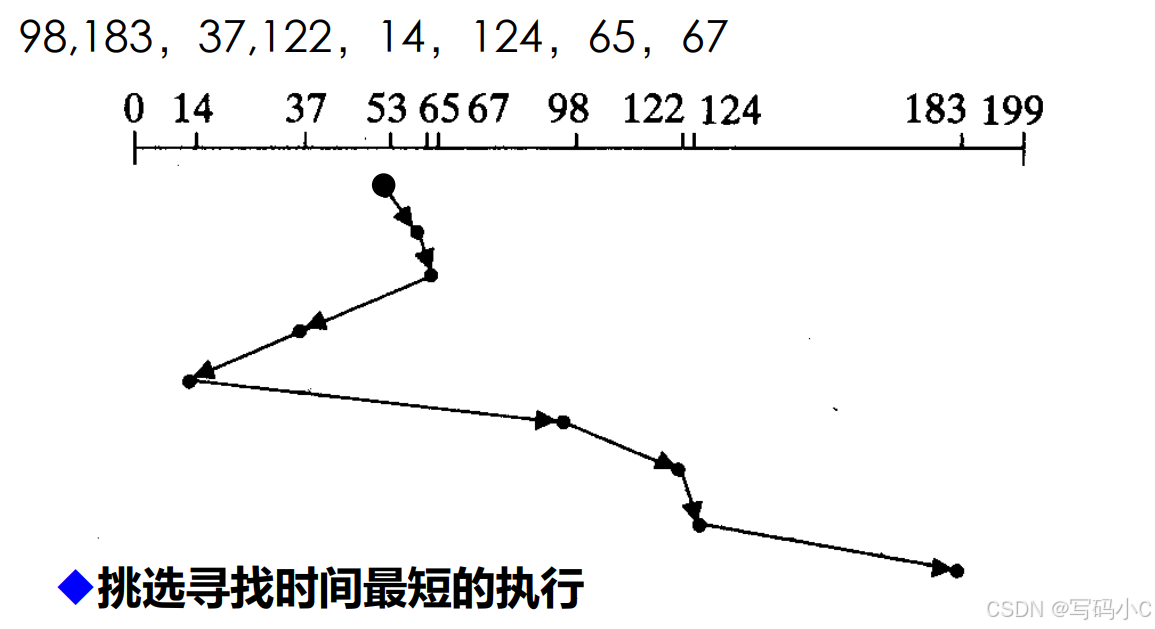 - 缺点 :可能产生 "饥饿" 现象。如果一直有附近的请求源源不断地来,远处的请求(如 183)可能永远排不上队。