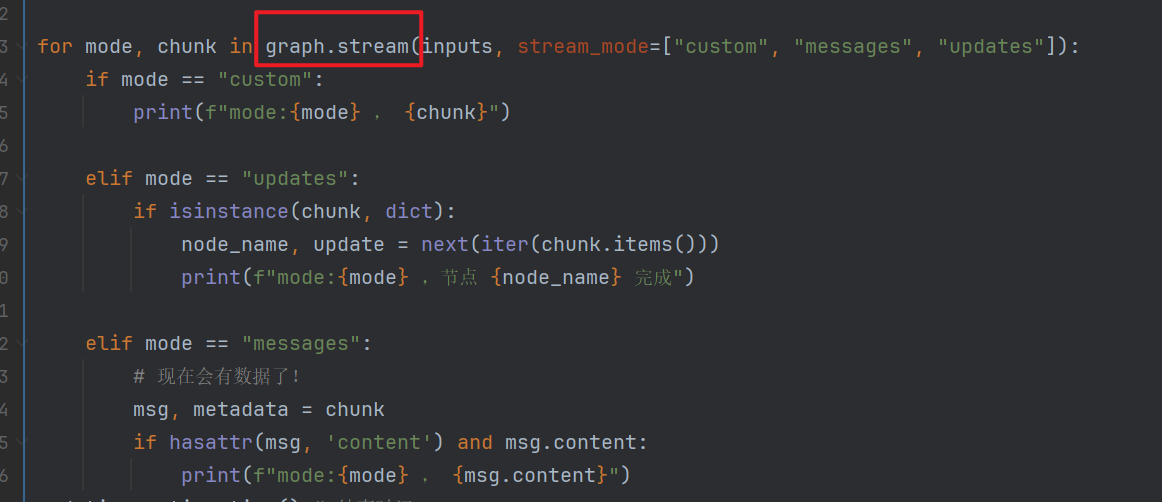 我们在前面使用了stream方法,传入了stream_mode="updates" ,我们还有别的模式方法