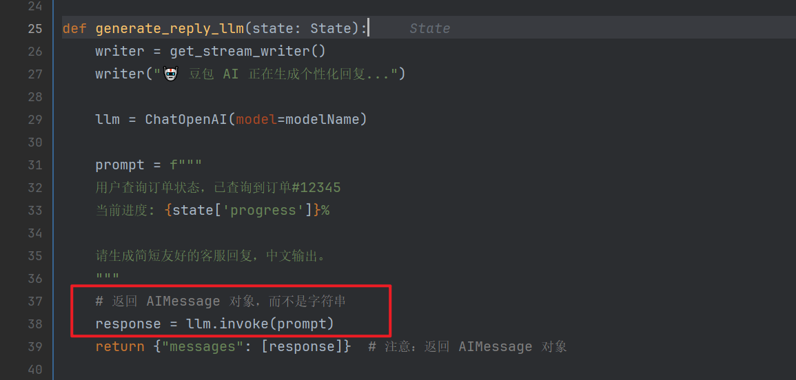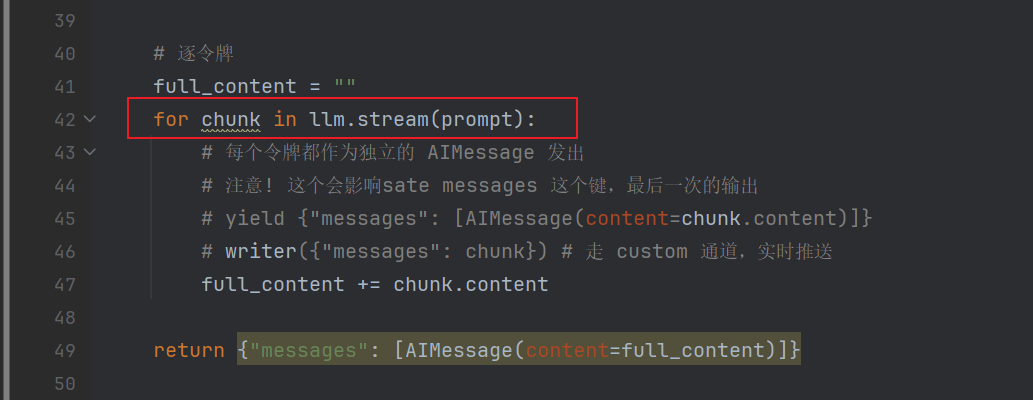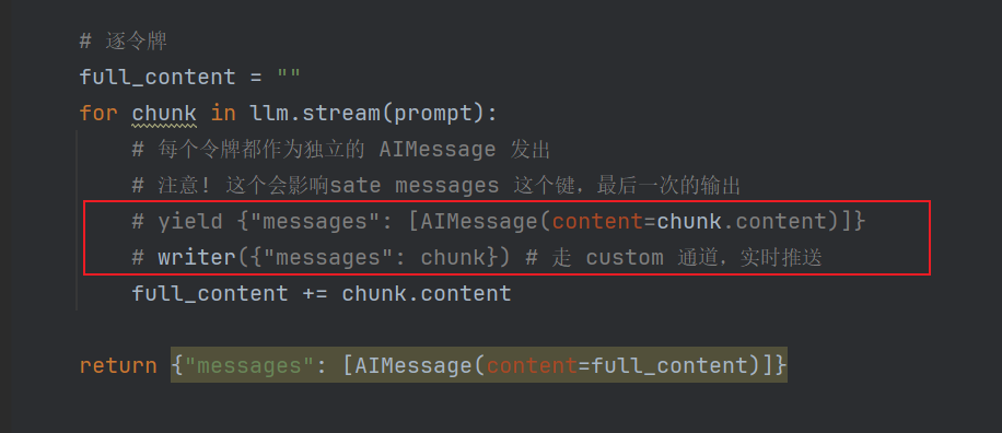 llm.invoke(...):模型先完整生成,再一次性返回完整AIMessage。 - 外层