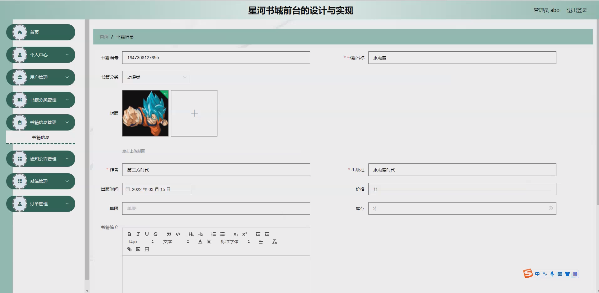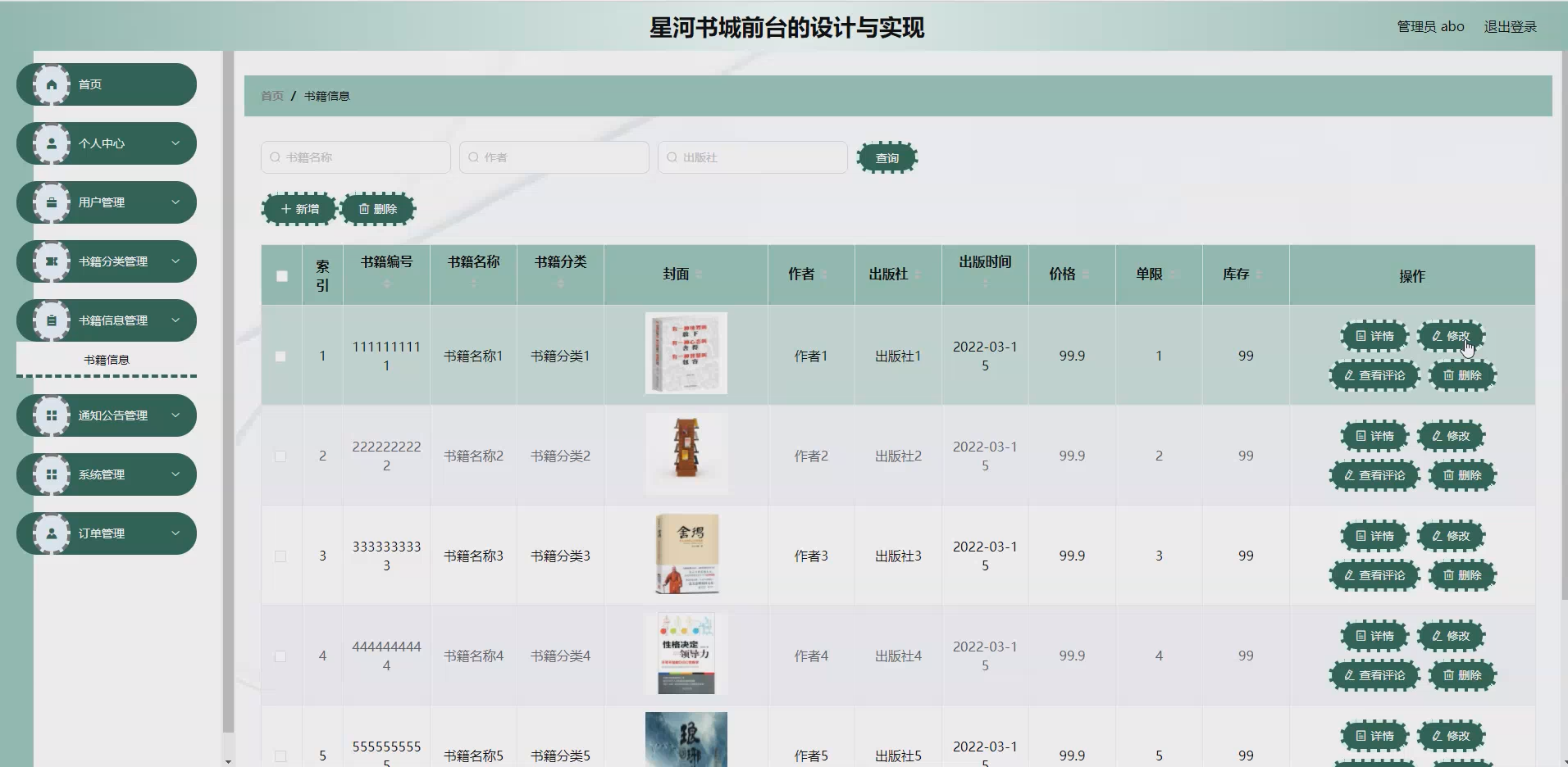 书籍信息模块:展示书籍名称、作者、出版社、价格、简介、目录等信息,支持按书名、作者搜索,列表页与详情页结合展示,详情页含用户评价功能。