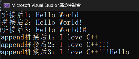 +=运算符(简洁高效,推荐日常使用),支持拼接string对象、字符串常量、单个字符 - 方式 2: