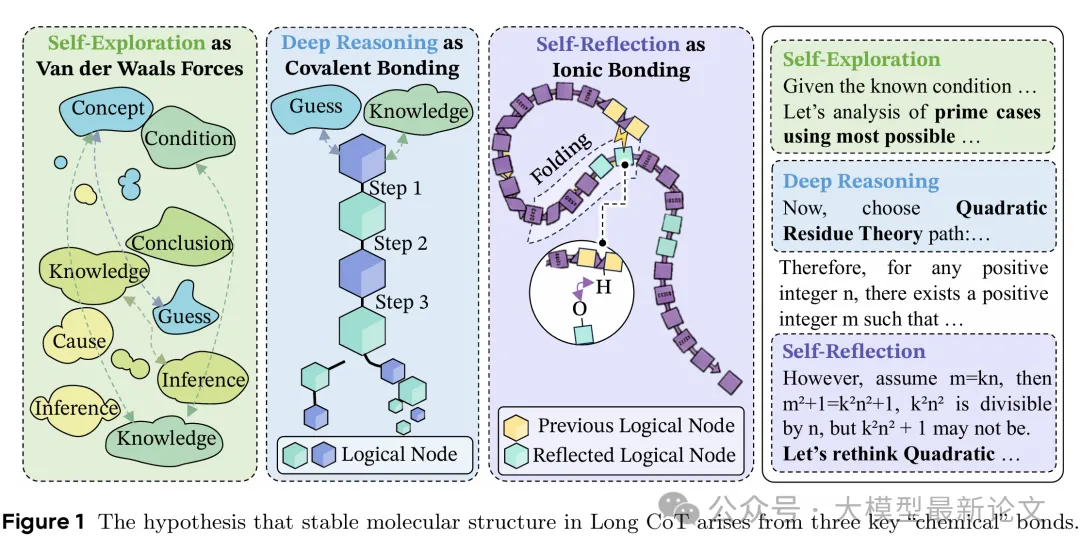 但研究团队的分析揭示,仅仅通过这些简单的二维结构,无法充分建模推理步骤之间的转移方式。具体地,作者认为推理步骤之间存在多种强度、方向不同的连接模式,它们在隐空间中 "自然延伸"、"峰回路转"、"灵活发散" ,形成了类似于化学分子的高维空间结构,并最终体现出不同的行为模式
