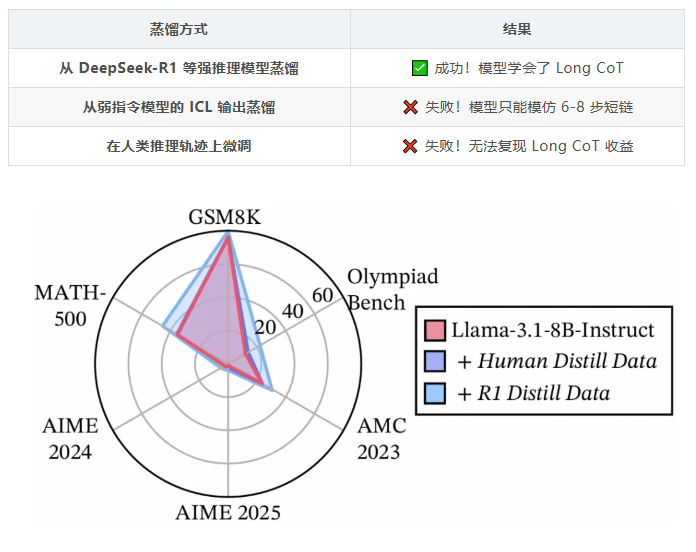 大模型通过长思维链(Long CoT)推理在复杂任务上展现出令人惊叹的能力。DeepSeek-R1、QwQ-32B 等强推理模型能够进行上百步的逻辑推导,解决高难度数学问题。自然而然,我们会想:能否通过蒸馏,让小模型也学会这种能力?
