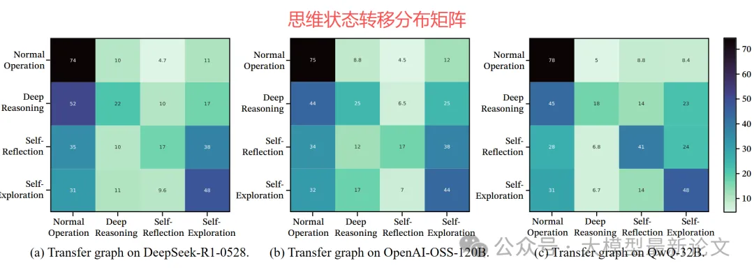 - 某个状态 A→B:R1 倾向深度推理(70%),OSS 倾向探索(60%)