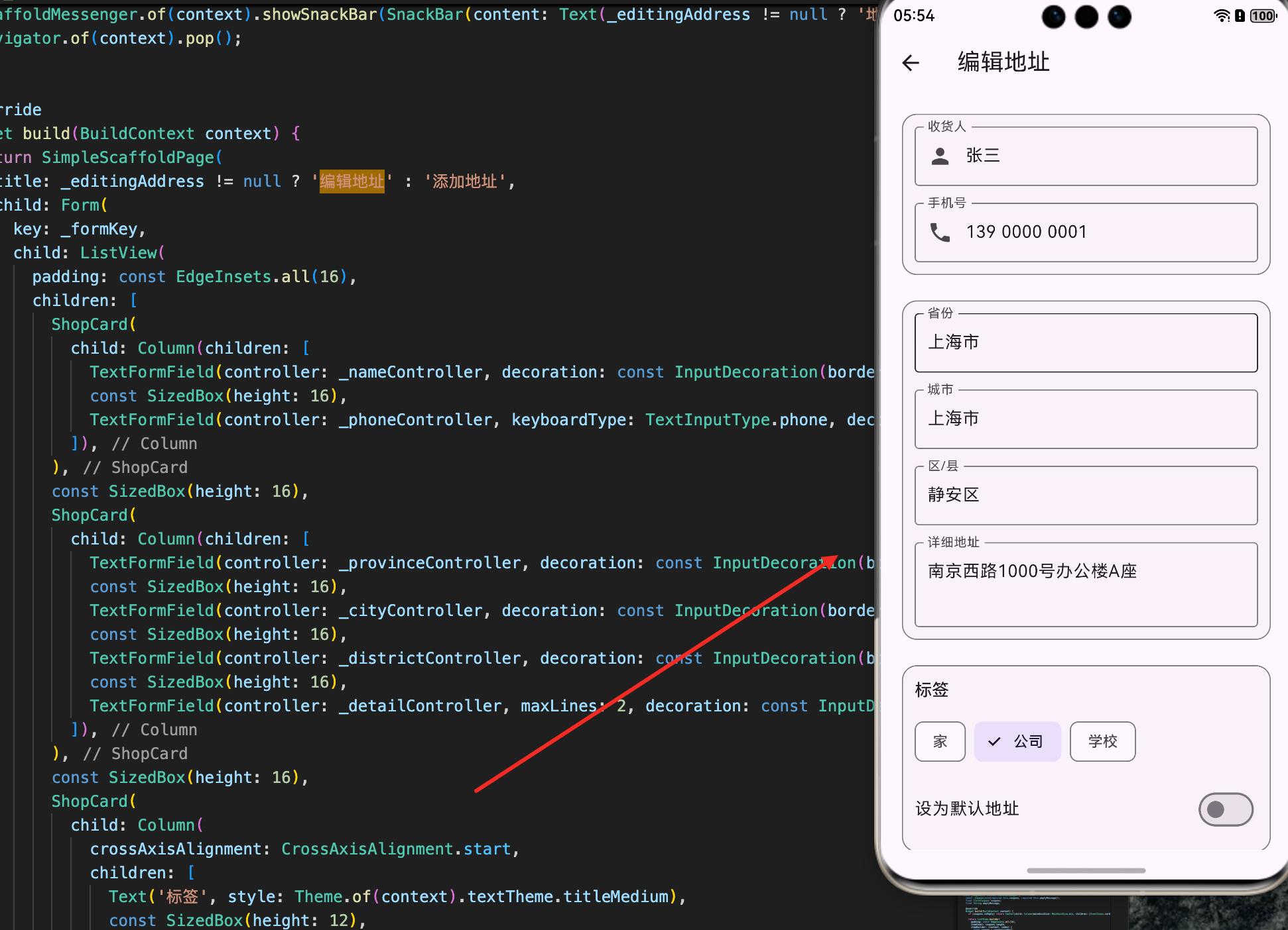 地址编辑是地址管理系统中的核心功能。用户需要能够添加新地址、编辑现有地址、验证地址信息的完整性和正确性。一个完整的地址编辑系统需要支持表单验证、数据持久化、默认地址管理、地址标签分类等功能。本文将详细讲解如何在 Flutter for OpenHarmony 项目中实现一个功能完整的地址编辑页面,包括表单设计、数据验证、状态管理、用户反馈和错误处理等功能。