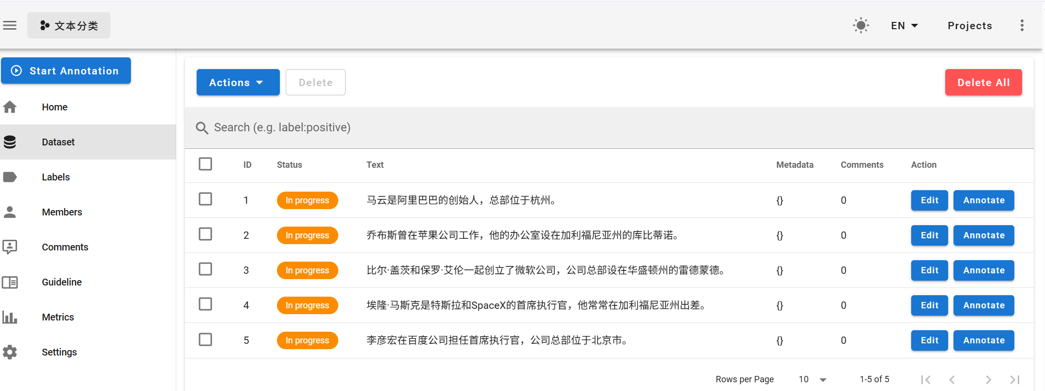 Doccano(多卡诺)是一种用于文本标注的开源工具,支持多种常见的文本标注任务,如命名实体识别、文本分类、关系抽取等。