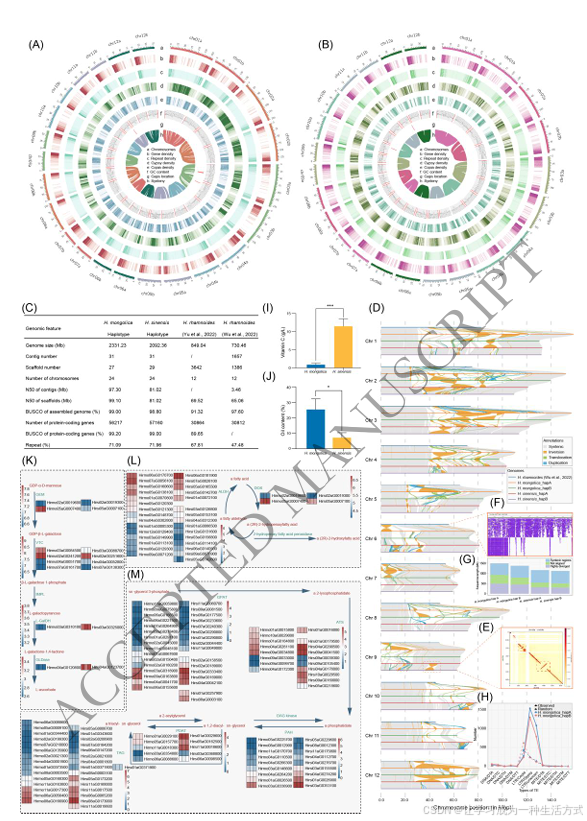 两个沙棘亚种在果肉维生素 C(VC)含量和种子含油量方面存在显著差异(图 1I-J):中国沙棘果肉 VC 含量显著高于蒙古沙棘(图 1I)。为阐明该性状的分子机制,本研究分析了抗坏血酸(VC)生物合成途径,发现 GDP-L - 半乳糖磷酸化酶(VTC,基因 ID:Hirsi04aG0052800)、L - 半乳糖脱氢酶(L-GalDH,基因 ID:Hirsi03aG0325000)和 L - 半乳糖酸 - 1,4 - 内酯脱氢酶(GLDase,基因 ID:Hirsi04aG0123700)等关键基因在中国沙棘中的表达水平显著高于蒙古沙棘(图 1K),与 VC 含量差异趋势一致。统计分析表明,这些基因在两个亚种间的表达差异具有统计学意义(t 检验,p < 0.05),提示其上调表达可能是中国沙棘 VC 积累量更高的重要原因(图 1I)。